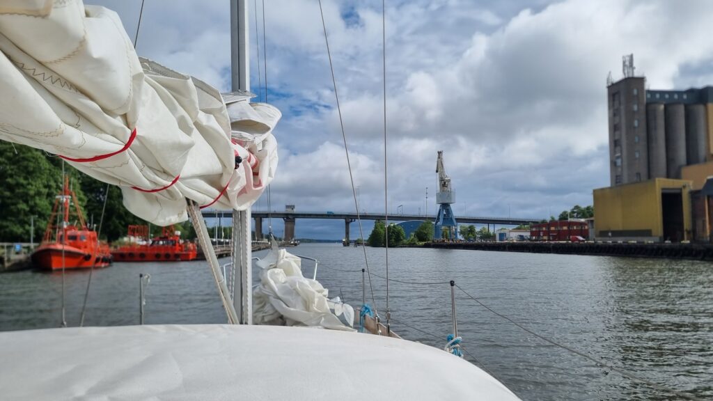 Att sätta segel var en upplevelse. Jag hade haft uppe genuan förut, men inte storen, och det visade sig att den inte ville komma högre upp än första revet så det var bra att vi hade gott om plats för det tog ett tag att komma till den insikten. Det är oklart vad orsaken är, vi får titta på det i höst, men antingen kärvar fallet eller så kärvar seglet.