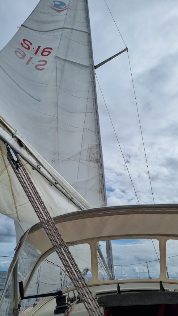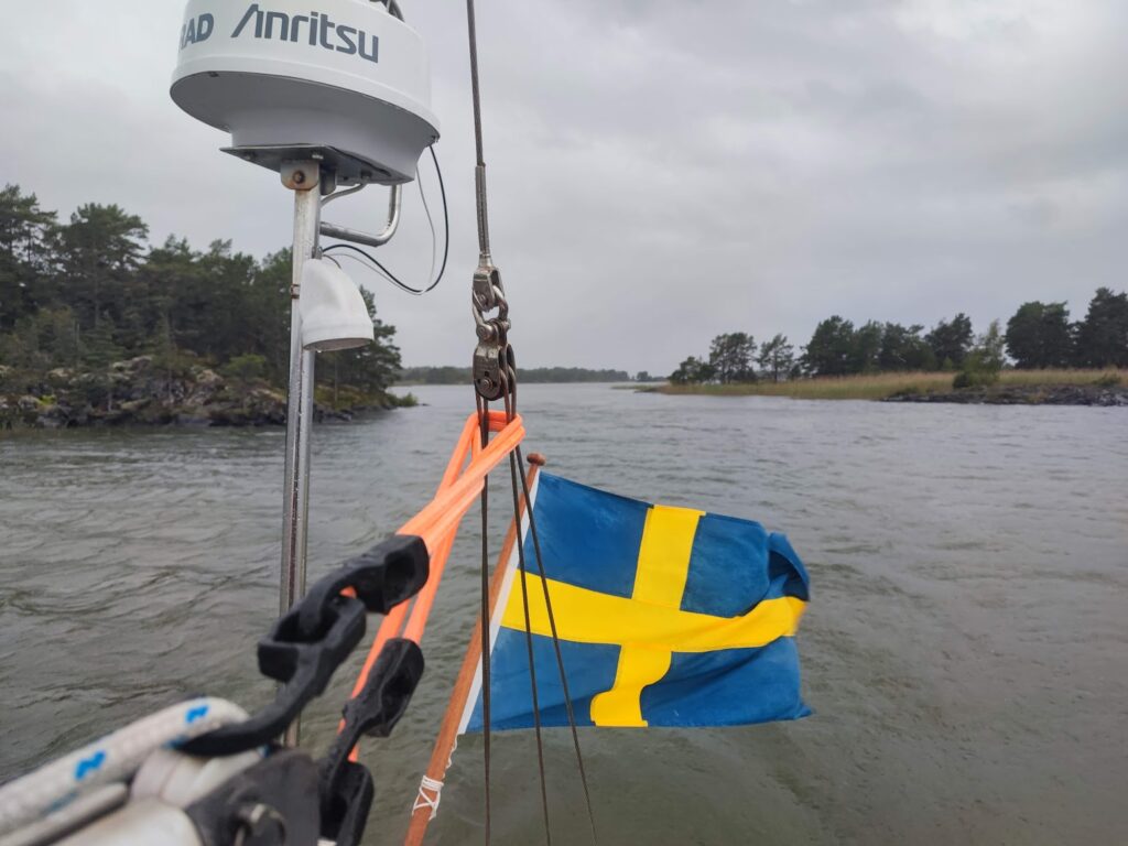 Vi försökte oss på att använda autopiloten också eftersom det skulle bli en rätt lång segling på samma kurs – en rorkultsautopilot. Nu när vi hade laddning gick det ju att lägga el på sådant, så Monika hade fått ta med sig den hemifrån i ryggan när hon åkte ner. Dock lyckades vi aldrig förstå oss på hur man skulle ställa in den och det var lite lurigt att mecka med den när man seglade, så det blev handstyrt hela vägen. Jag misstänker att man måste läsa manualen…