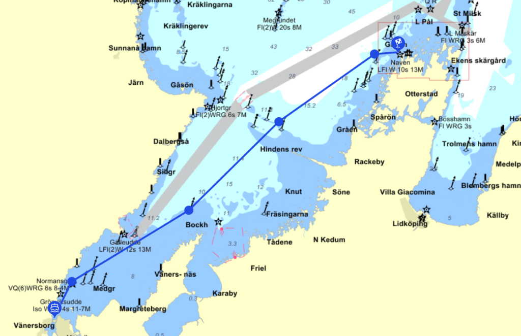 Eftersom det var första gången vi skulle sätta segel så hade vi lagt en ganska konservativ kurs en bra bit utanför Normansgrundet dit vi gick för motor. Sedan var planen att passera n strax utanför Hindens rev, och därefter mot Navens fyr – en sträcka på cirka 32 distans. Det finns ett antal kardinalmärken i Vänern som kan användas för navigeringen så vi la kurs mellan dem.