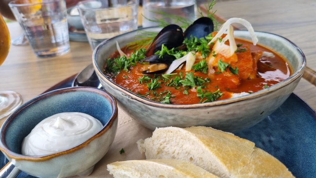 I Stavsnäs vinterhamn fanns det en sjökrog och där åt vi en gedigen bouillabaisse vilket kändes oerhört rättvist efter regnet.