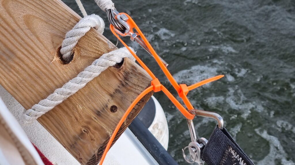 Två fendrar sprang läck när de gjorde sitt jobb, en båtshake gick sönder eftersom jag var optimistisk över vad den skulle tåla, och så skruvade ena mantågsremmens vantskruv ur sig trots låsmuttrar och ramlade av nånstans utanför Mariestad. Spännband ersatte (buntband på bilden, men det var den tillfälliga tillfälliga lagningen).