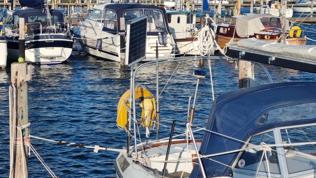 Det gör dock inget med lite mer ström, så under hösten har jag skaffat två stycken avlånga 100W-paneler som skall hängas på mantågen. Det kommer inte att bli optimal vinkel men det blir det knappt ändå någonstans på en segelbåt som har en massa grejor som orsakar skugga, och med lite flyt så får vi ur dem ytterligare 50W eller så totalt i snitt över tid. “Enligt folk på internet” så reflekteras en del ljus upp från vattenytan också (och har man varit på sjön så vet man hur dj-a solbränd man kan bli så det kan nog stämma) vilket ger förstärkning av effekten.