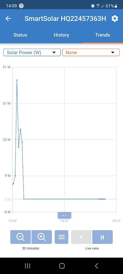Solpanelen vi skaffade innan vi lagade laddningen visade sig fungera rätt så bra när den väl var inkopplad, åtminstone om man la den resonabelt oskuggat.
