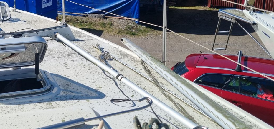 Smutsen var rätt lätt att ta bort som tur var, men vi upptäckte på Vänern att det inte gick att få upp seglet ovanför första revet, och det fick vi aldrig ordning på. Vid kontroll så löpte både fall och travare bra i masten så min gissning har hela tiden varit bommen.