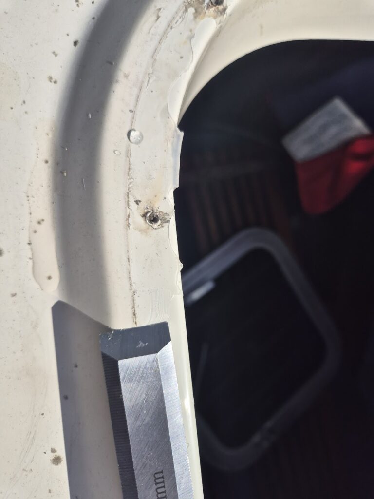 Tätningen bestod av någon millimeter smetad silikon och skruvarna var vackert nedskruvade så att gelcoaten hade spruckit.