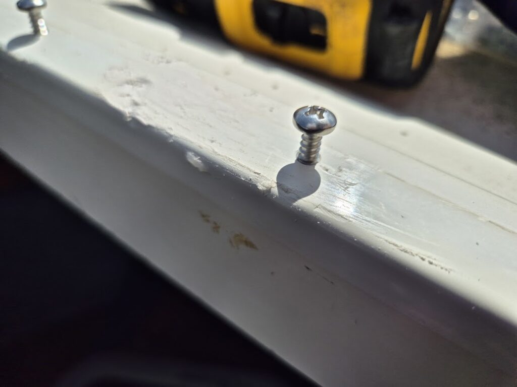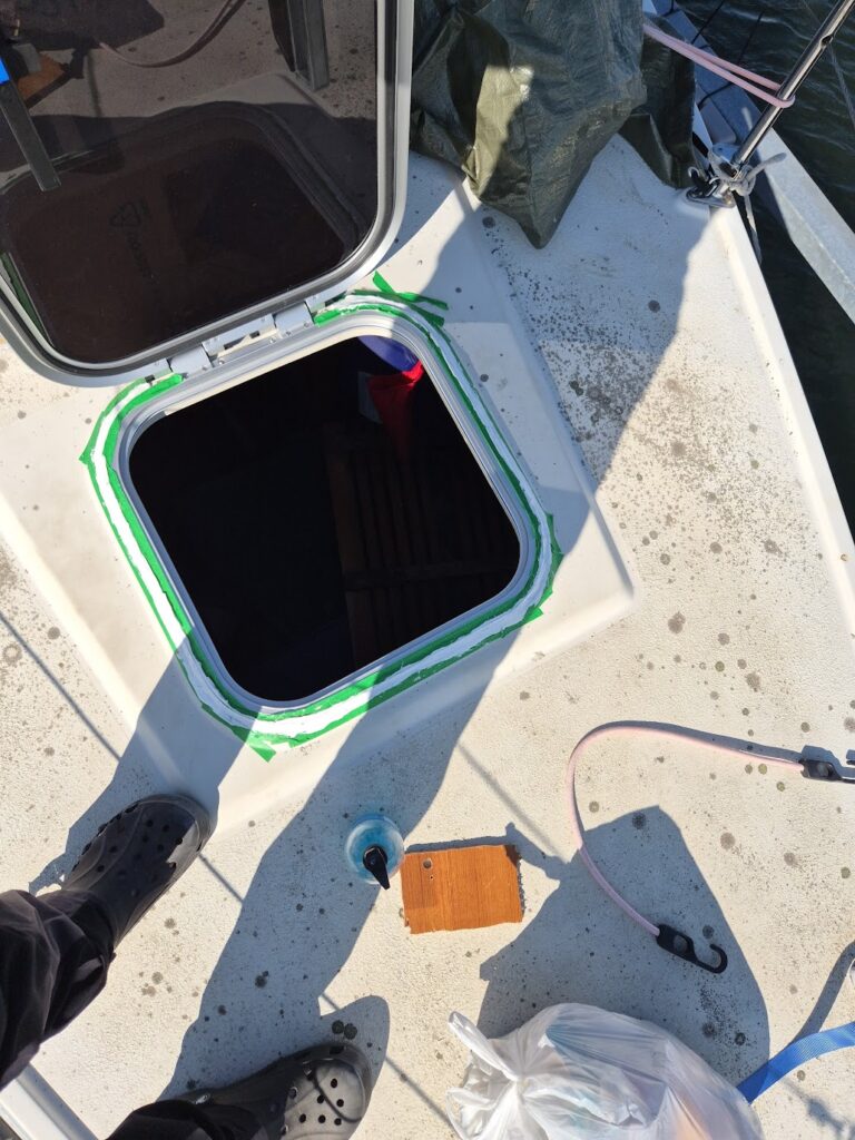 För att täta luckan använde jag butyltejp, vilket även rekommenderades av tillverkaren. Se även https://marinehowto.com/bed-it-tape/ . Skruvarna drogs åt, överskjutande butyltejp togs bort, och ett lager vit marintätning lades ovanpå för att isolera den kletiga butyltejpen från världen.