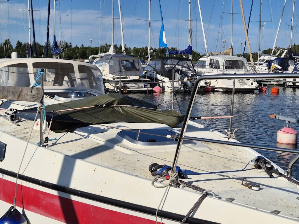 Varvet som byggde båten hade i sin oändliga visdom monterat en Houdinilucka i förpiken. Den läckte så vi fick köra hem båten med presenning över fören vilket inte bara är fult utan även opraktiskt.