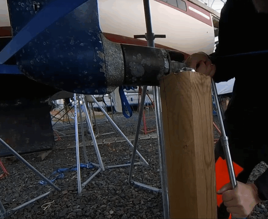 Propellernavet dras fast i drevets axel med 70 Nm och sitter alltså hyfsat bra fast. Såpass bra att vi inte lyckades hålla emot och få loss det direkt när vi tog upp. Inte nog med att det var svårt att hålla emot, hyls-jvln slant eftersom förlängaren var för lång, och det är för trångt i mitten av navet för att köra utan.